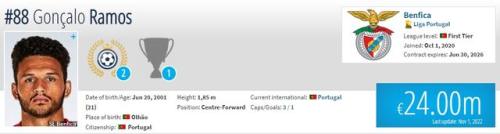 在德国《转会市场》网站上,冈萨洛-拉莫斯的身价已经来到2400万欧元,进一步上涨基本不成问题。