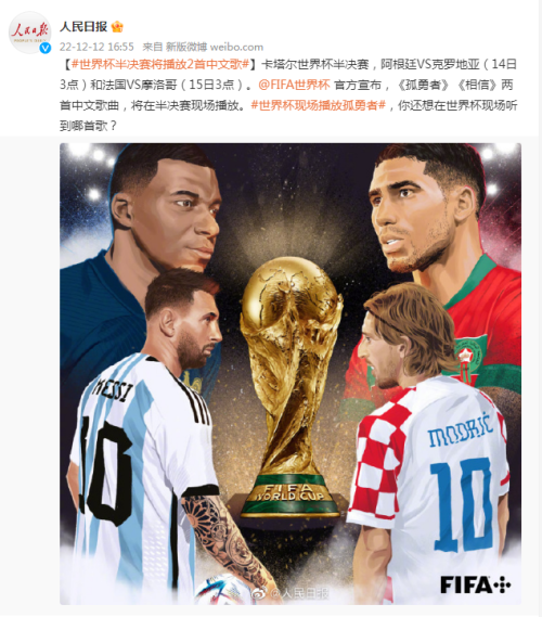 在卡塔尔世界杯半决赛中,阿根廷将在14日3点对战克罗地亚,法国将在15日3点对战摩洛哥。此外,世界杯官方宣布,《孤勇者》、《相信》两首中文歌曲将在半决赛现场播放。你还想在世界杯现场听到哪首歌?